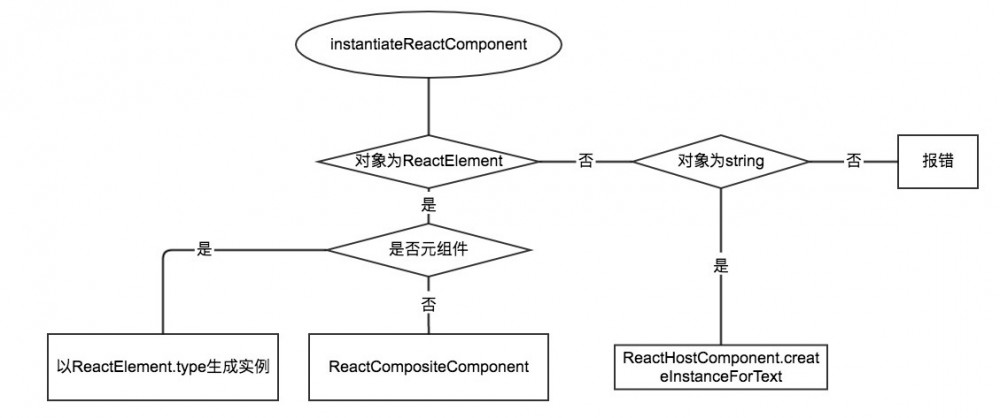 这段代码的逻辑可以在 instantiateReactComponent.js 中看到,它是这样一个流程:当对象是 ReactElement 时,如果是元组件,就直接根据之前传入 ReactElement 的type生成实例;否则就生成一个 ReactCompositeComponent (即复合组件)。