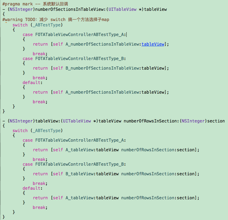 我们就以 iOS 中典型的 UITabelView 中的 Delegate 和 DataSource 的协议函数分 A/B 方案来说;