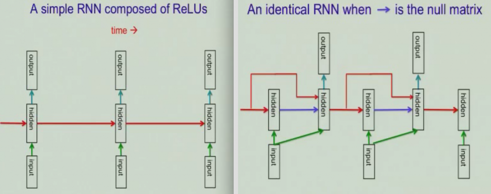让我们从 ReLU RNN 开始。ReLU RNN 很易于训练,而且很擅长学习长期依赖(长期记忆)。下面的左图表示了普通的 RNN,右图则表示一个相同的 RNN(如果我们使用空矩阵进行了「隐藏→隐藏」权重初始化,如蓝色箭头所示)。为了应用快速权重的思想,这里使用了外积学习规则(outer product learning rule)来更新快速权重矩阵 A。