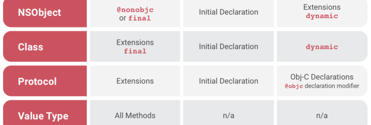 这张表总结引用类型, 修饰符和它们对于 Swift 函数派发的影响