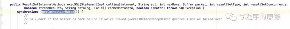 execSQL 是一个非常重要的方法,所有SQL语句的最终都是交由这个代码来实现的;这个方法被一个 connectionMutex 锁(这个锁其实就是Connection对象自己,Mysql客户端通过使用了“反射”所以不能直接使用 this )包裹着这就意味着—— 在同一时刻一个Mysql连接只能执行一条SQL语句 。