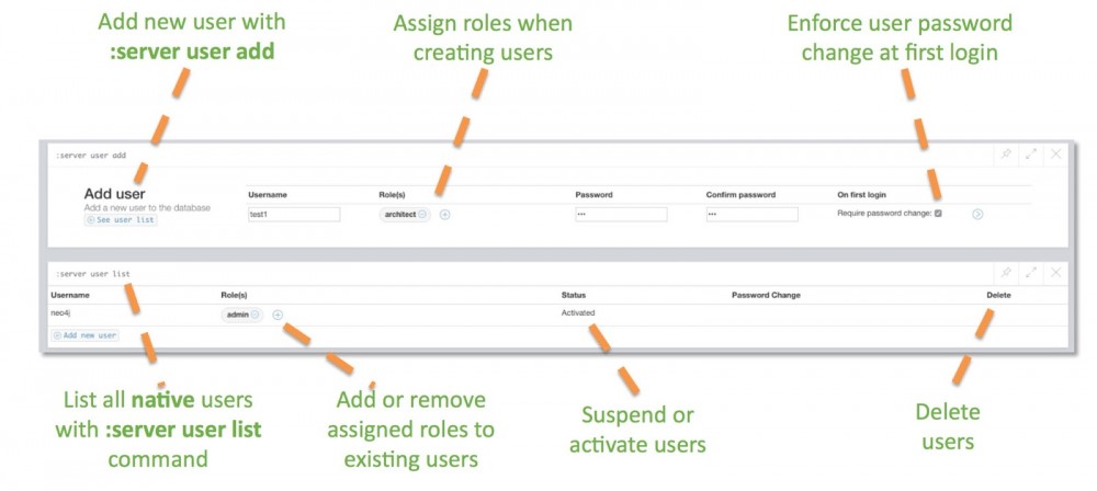 对于原生用户的管理(创建、终止、删除),Neo4j Browser提供了UI并指派了构建于一些过程之上的角色,这些过程也可用于你自身的运营工具。对于与LDAP/Active Directory的集成,安全模型给出了细粒度的配置CAPA。