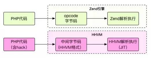 默认情况下,Zend引擎先将PHP源码编译为opcode,然后Zend解析引擎逐条执行。这里的opcode码,可以理解成C语言级的函数。而HHVM提升性能方式为替代Zend引擎将PHP代码转换成中间字节码(HHVM自己的中间字节码,通常称为中间语言),然后在运行时通过即时(JIT)编译器将这些字节码转换成x64的机器码,类似于Java的JVM。
