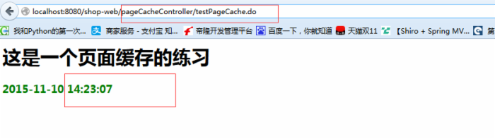 testPageFragmentCache.jsp页面,为了方便我还是调用了上边的controller方法来观察时间。如果你是按照我的做法一步一步做的话,要测试局部缓存时,需要把页面整体缓存的filter注释掉,实际中不需要,只是我为了偷懒用了相同访问地址