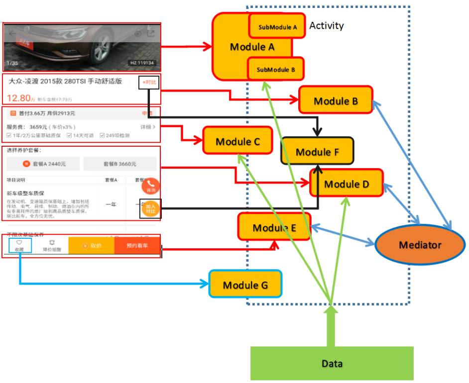 视图模块本身还可以再进行拆分,如果有逻辑再分层需要的话,比如Module A在内部又将功能分包给了SubModule A和SubModule B。业务视图模块的另外一个特点是不依赖于视图的真正的布局细节,比如上图的Module F, 其负责了车辆详情页的对比子功能,那么,车辆标题右边的增加对比按钮和悬浮的对比按钮就都是其应该管辖的视图片段,而不会意味两者处于不同的布局层就分模块处理,这也反映了视图模块拆分以业务为粒度的原则。