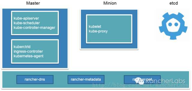 Kubernetes各个组件的角色可以归为三类即Master、Minion、Etcd,Master主要是kube-apiserver、kube-scheduler、kube-controller-manager,Minion主要是kubelet和kube-proxy。Rancher为了融合k8s的管控功能,又在Master中添加了kuberctrld、ingress-controller、kubernetes-agent三个服务来打通Rancher和K8s,同时每个node上都会依赖Rancher提供的Rancher-DNS、Rancher-metadata、Rancher-net这些基础设施服务。