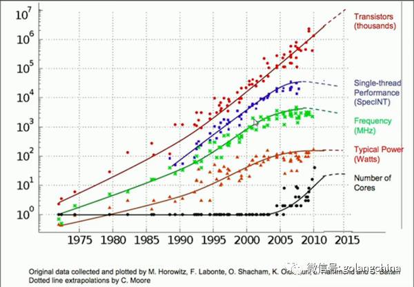 摩尔定律正在失效 第一个具有3.0GHz时钟速度的Pentium 4处理器是由英特尔于2004年推出的。 而今天,我的Mackbook Pro 2016的CPU时钟速度为2.9GHz。 可以看到在过去的十年中,CPU处理能力没有太大的进步。 您可以在下面的图表中看到这一点。