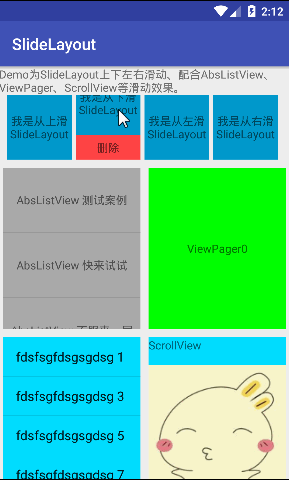 纯手工超级迷你轻量级全方向完美滑动处理侧滑控件(比官方 support v4 包 SlidingPaneLayout 控件更加 Q 迷你,累计代码不足 300 行),支持上下左右有各种侧拉,可配置侧拉松手临界距离,支持单独使用、ListView、GridView、RecycleView、ScrollView、ViewPager 等各种嵌套(作为 item 使用或者作为以上所有控件的父容器使用),具体不同配置展示效果如下图。