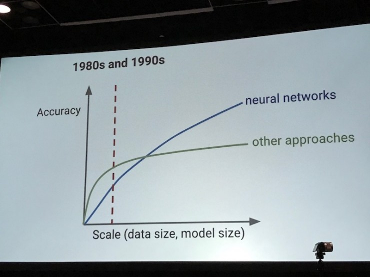 在深度学习的历史上,神经网络的方法在1980-1990年之后开始明显地发挥效力,在数据量、计算力的推动下,用深度学习神经网络的方法使得我们在研究和开发上获得了比其它方法更高的准确率(在图像、语音等领域)。在2011年之前,深度学习的方法能达到的图像误识率都是26%,而在今天这个数字超过了人类的误识率(5%),达到了3%。在Google今天的产品线中深度学习的方法使用非常广泛,包括Android平台、各类App中、药物研究、Gmail等等。