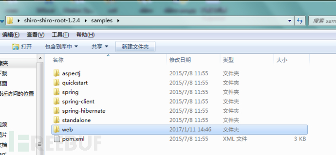 解压完成之后,进入目录shiro-shiro-root-1.2.4/samples/web ,由于是maven构建的开源工程,我们需要先将工程转换成war包来部署。