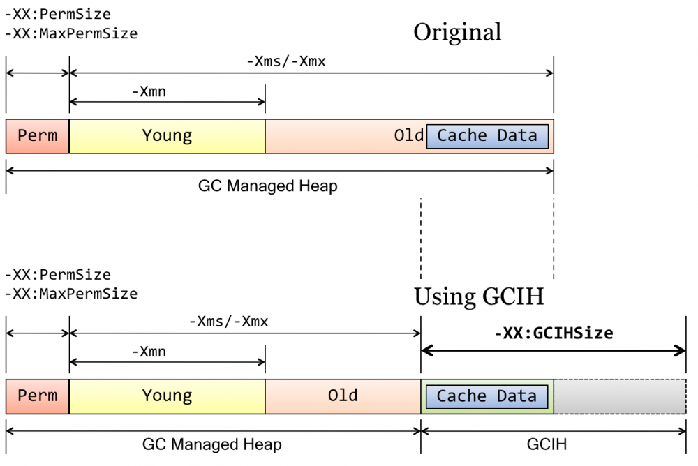 这个idea最初来源于TaobaoJVM对OpenJDK定制开发的GCIH部分(详见 撒迦 的分享- JVM定制改进@淘宝 ), 其中GCIH就是将CMS Old Heap区的一部分划分出来, 这部分内存虽然还在堆内, 但已不被GC所管理. 将长生命周期Java对象放在Java堆外, GC不能管理GCIH内Java对象(GC Invisible Heap) :