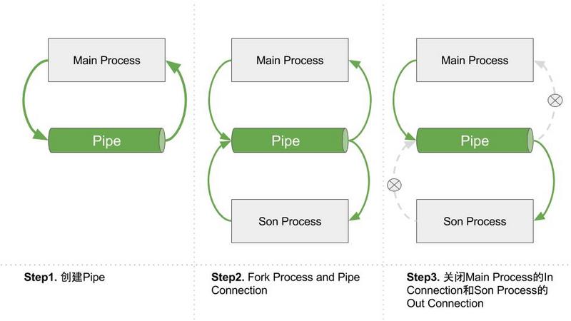 此后,关闭主进程的一个Out Connection,关闭一个子进程的一个In Connection。那么就建立好了一个输入在主进程,输出在子进程的管道。