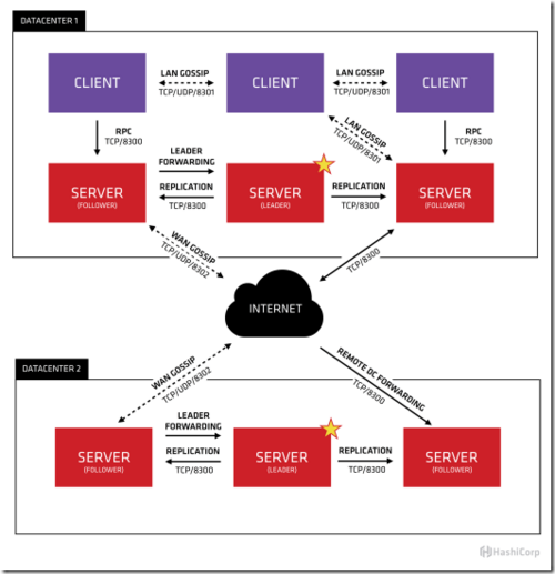 server节点也作为WAN gossip Pool的一部分。这个Pool不同于LAN Pool,因为它是为了优化互联网更高的延迟,并且它只包含其他Consul server节点。这个Pool的目的是为了允许数据中心能够以low-touch的方式发现彼此。这使得一个新的数据中心可以很容易的加入现存的WAN gossip。因为server都运行在这个pool中,它也支持跨数据中心请求。当一个server收到来自另一个数据中心的请求时,它随即转发给正确数据中想一个server。该server再转发给本地leader。