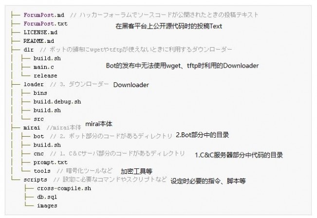 C&C服务器部分为Go语言,Bot、下载部分以及其他的加密工具等主要为C语言。对照被公开存储的目录,Mirai的构成如下(List 1)