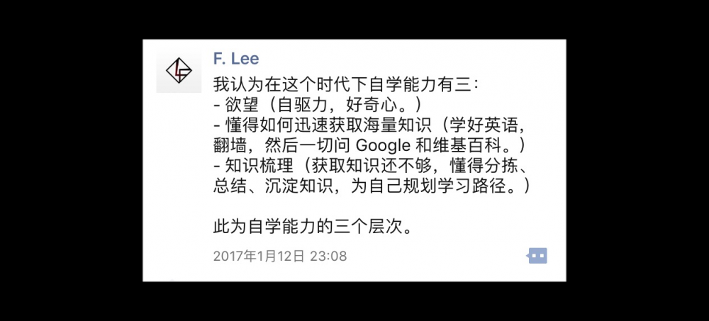 昨晚发了这样一条朋友圈,分享了我对于「自学能力」的理解。今天试着结合我的经历聊聊为什么我有这样的想法。