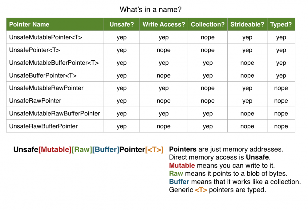Swift 的指针类型使用了很清晰的命名,我们可以通过名字知道这是一个什么类型的指针。可变或者不可变,原生(raw)或者有类型的,是否是缓冲(buffer)类型,这三种特性总共组合出了 8 种指针类型。