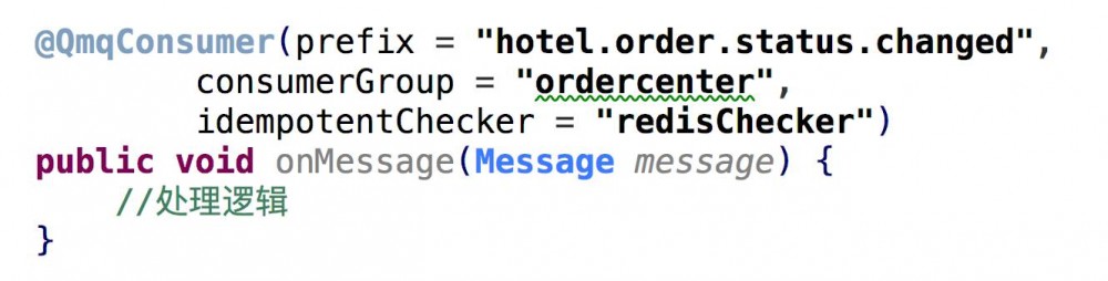 如果我们不能接受重复消息,但是我们的业务逻辑自身又没办法处理重复消息该怎么办呢?那就得借助额外的手段了。也就是引入一个去重表,我们在从消息里提取一个或多个字段作为我们去重表的唯一索引,在消息处理成功的时候我们在去重表记录,如果又接到重复的消息先查去重表,如果已经成功消费过这个消息则直接返回成功就行了。而且我们还可以根据我们对去重这个事情要求的可靠等级选择将去重表建在不同的位置:数据库或redis等。放在redis里那么去重的可靠性就是redis的可靠性,一般达到99.9%应该是没有问题的,而且放在redis里我们可以设置一个过期时间,因为重复消息这个东西一般会在一个短期时间区间内发生,比如很少几个小时后甚至是几分钟后还出现重复消息。那么如果我们对可靠性要求更高则可以将去重表放在数据库里,但使用数据库成本也更高,而且数据库一般没有自动过期机制,所以可能还需要一个自动的『垃圾回收』处理机制,将多久之前的去重表里的数据删除掉。看起来引入额外的去重机制是不是很麻烦?不用担心,QMQ已经为你提供了幂等检查器这种机制,只要简单的配置一下就ok了:
