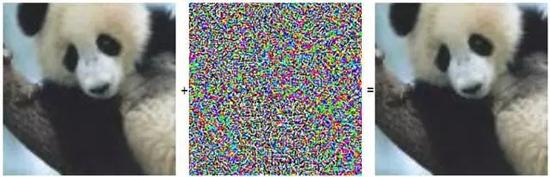 左图被神经网络以60%的置信度将它识别为“熊猫”,然后给它人为叠加上中图所示微小的扰动(实际叠加权重只有0.7%),得到右图。在人类看来,几乎没有什么变化,但人工智能却以99.3%的置信度识别为“长臂猿”。