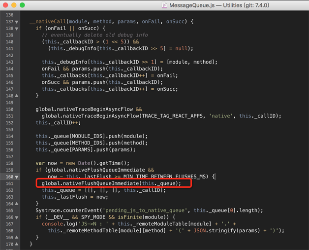 先从 JS 端看起,如图 1 所示,JS 调用 Native 的逻辑在 MessageQueue.js 的 _nativeCall 方法中。在最小调用间隔(MIN_TIME_BETWEEN_FLUSHES_MS=5ms)内,JS 端会将调用信息存储在 _queue 数组中,通过 global. nativeFlushQueueImmediate 方法来调用 Native 端的功能。global.nativeFlushQueueImmediate 方法在 iOS 端映射的是一个全局的 Block,如图 2 所示。