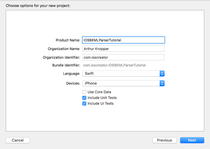 打开 Xcode 并且新建一个单视窗应用。名字就叫 IOS9XMLParserTutorial,组织名字和组织标识自己定。语言选 Swift,设备只选 iPhone。