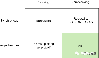从内核角度看I/O操作分为两步:用户层API调用;内核层完成系统调用(发起I/O请求)。所以“异步/同步”的是指API调用;“阻塞/非阻塞”是指内核完成I/O调用的模式。用一幅图表示更加明显