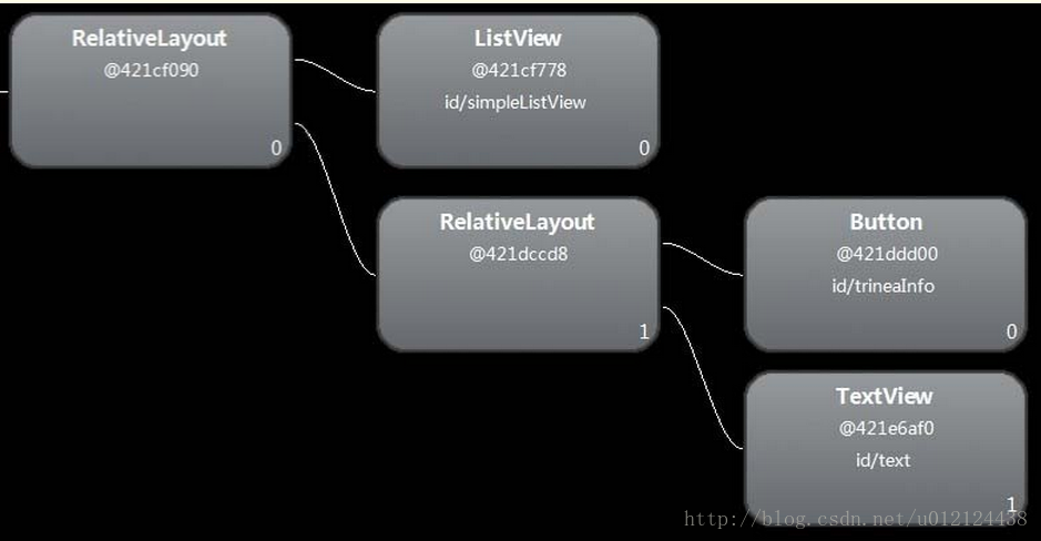 5)观察层次结构图,这个图有点大,可以拖动。View Hierarchy窗口显示了Activity的所有View对象,选中某个View还可以查看View的具体信息,最好选择工具中的Show Extras选项。