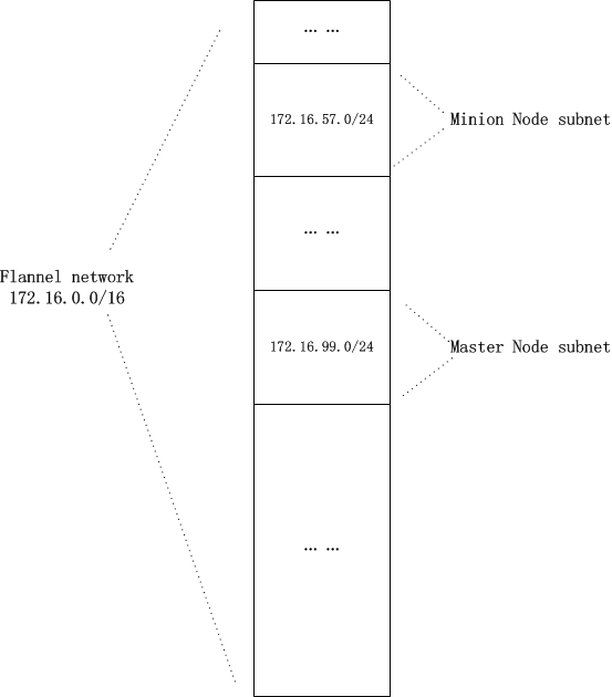 master node: # ip route ... ... 172.16.0.0/16 dev flannel.1 proto kernel scope link src 172.16.99.0 172.16.99.0/24 dev docker0 proto kernel scope link src 172.16.99.1 ... ... minion node: # ip route ... ... 172.16.0.0/16 dev flannel.1 172.16.57.0/24 dev docker0 proto kernel scope link src 172.16.57.1 ... ...