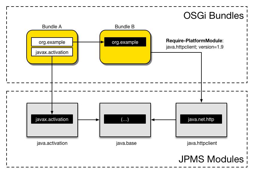 但是,我们希望能够做得更好一些。当OSGi运行在模块化的Java 9平台中,我们应该能够使用平台中的模块。例如,某个OSGi bundle可能会声明它所依赖的平台模块集合——也就是说,我们应该能让OSGi bundle直接声明对JPMS模块的依赖。OSGi框架应该能够在运行时遵循这些依赖,工具应该基于这些依赖准备运行时环境。