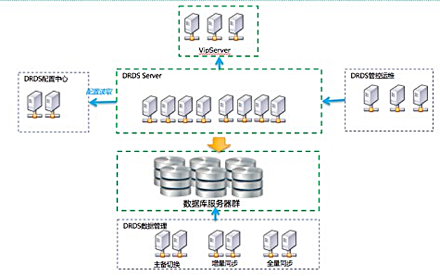 DRDS的整体架构DRDS/TDDL是典型的水平扩展分布式数据库模型,区别于传统单机数据库share anything架构,DRDS/TDDL采用share nothing架构,share nothing架构核心思路利用普通的服务器,将单机数据拆分到底层的多个数据库实例上,通过统一的Proxy集群进行SQL解析优化、路由和结果聚合,对外暴露简单唯一的数据库链接。整体架构如图1所示,包含DRDS服务模块、DRDS管控模块、配置中心、监控运维、数据库服务集群、域名服务模块。
