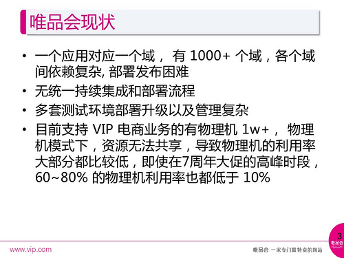 唯品会线上全部用物理机在跑,之前Openstack方式没有在线上,只是在测试环境跑,物理机的使用效率还是比较低的。即使在7周年大促的高峰时段,60~80%的物理机利用率也均低于10%。