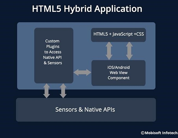不管iOS、Android,还是Windows Phone,在它们的SDK中都包含了一个非常高级的浏览器组件。借助这个WebView组件,程序员能够使用标准的HTML5 Web技术实现对应用的设计和编码。最终,在应用的组成中,至少会有一个原生frame还会有在WebView中执行的HTML/JavaScript——这也是为什么它们被称为“混合”应用。在需要传感器输入的特性中,比如地理位置、摄像头,以及像访问文件系统这样的底层的功能,通常会使用混合应用框架所提供的JavaScript-to-native桥。