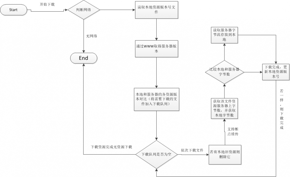 现在问题聚焦在解决资源下载问题,笔者使用了另一种解决方案:利用多线程断点续传解决资源下载问题,程序要事先打包一到两个关卡在包体中,保证玩家在断网的情况下或者是刚启动游戏时能够顺利的进入游戏。玩家在玩第一关卡的时间策划要计算好,这样可以保证在有 WiFi 网络的情况下,启动多线程在后台下载,可以同时启动两到三个线程,在玩家把关卡打完后其他关卡也会陆续保存在本地,这样可以保证游戏不会中断。当然如果出现断网的情况可以弹出提示让玩家打开 WiFi。再介绍一下断点续传功能,在下载资源的过程中防止网络中断导致下载的资源废掉,一旦网络检测不到,它会保存并记录已下载的资源字节位置,如果再检测到网络,线程自动继续下载,这跟我们使用的迅雷下载很类似。资源的下载是在用户不知情的情况下进行的,这样就不会妨碍用户体验,下面把多线程断点下载的流程图给开发者展示如下: