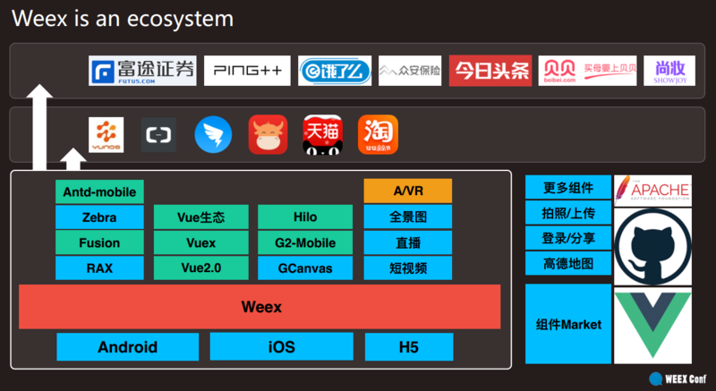 在2016年9月份,Weex团队宣布Vue.js作者尤雨溪加入团队担任技术顾问,随后在Weex和Vue生态互通上做了大量工作。