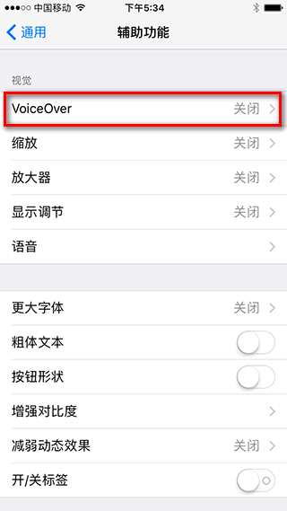 最快捷的是使用siri,“打开VoiceOver”,如果siri卖萌说不知道VoiceOver是什么鬼?那就手动开始,路径为:设置→通用→辅助功能→VoiceOver(在第一个,见下图)