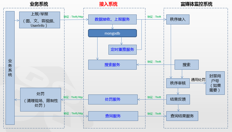 也就在去年的这个时候,我所在事业部发现几个 UGC 社区的小广告特别严重,Boss 要求所有社区必须接入公司的富媒体监控系统(负责公司所有业务的内容审核、处罚工作,以下简称监控系统),以实现 UGC 内容(包括文本、图片、音视频以及用户头像、昵称等UserInfo)的准实时上报与垃圾信息的自动处理(如清理现场、账号封禁等)。出于对业务服务的最小侵入、功能复用和流程统一等原则的考虑,抽象出介于业务系统和监控系统之间的接入系统,统一负责对数据的接收、上报、重推、搜索、结果查询以及对监控系统处罚指令的转发。该业务可简单抽象成图 1.1:
