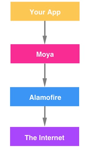 Moya是作用在Alamofire之上,让我们不再直接去使用Alamofire了,Moya也就可以看做我们的网络管理层,只不过他拥有更好更清晰的网络管理。可以看到下图,我们的APP直接操作Moya,让Moya去管理请求,不在跟Alamofire进行接触