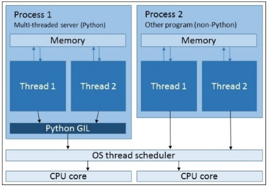 当线程需要执行操作时,它请求操作系统的线程调度程序给其分配一些CPU时间。调度程序根据各种参数来将CPU的核心分配给等待的线程,调度程序的实现根据操作系统的不同而不同。同一个进程中运行的不同线程可能同时运行在不同的CPU核心上(但CPython例外)。