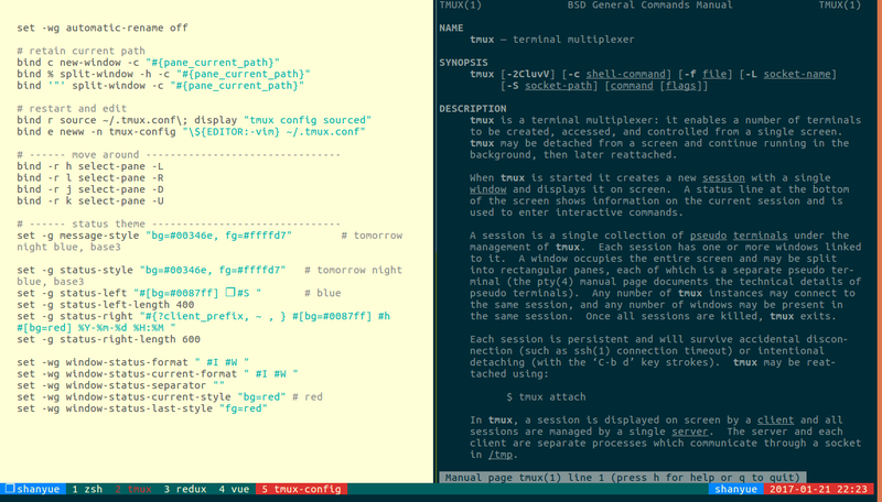 以下是我的配置文件地址,并在不断摸索与更新中 https://github.com/shfshanyue/tmux-config 。
