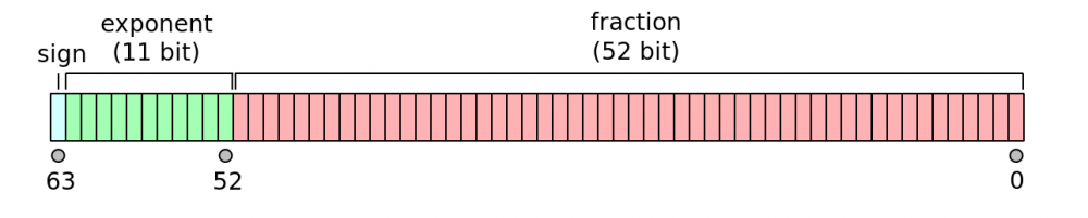 这一步是获取double的内部表示,一共64bit,刚好为long的长度。valBits采用BigEnding(大端序)表示,包含1个符号位,11个指数位,52个有效数位。格式如下所示:
