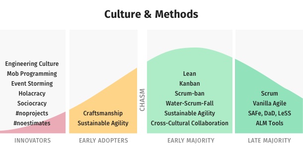 我们也考虑了一下我们的文化和方法的各种趋势处于Geoffrey Moore技术采用生命周期图上的什么位置。如下是我们认为的目前状态: