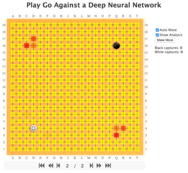 图中的颜色可以点击 "Show Analysis" 打开,是神经网络的最终输出。越红的地方,代表神经网络认为越可能成为下一手。你也可以把 "Auto Move" 关掉,自己和自己下。