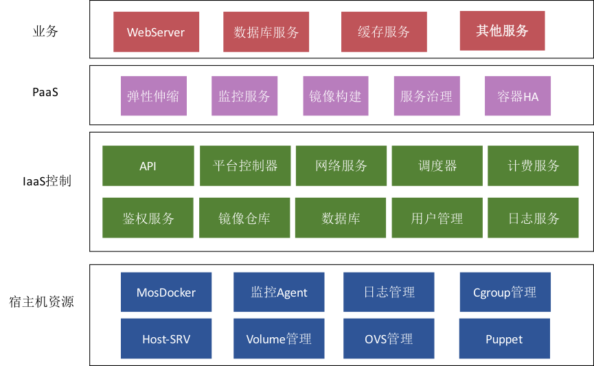 可以看出,容器平台整体架构自上而下分为业务层、PaaS层、IaaS控制层及宿主机资源层,这与美团云架构基本一致。
