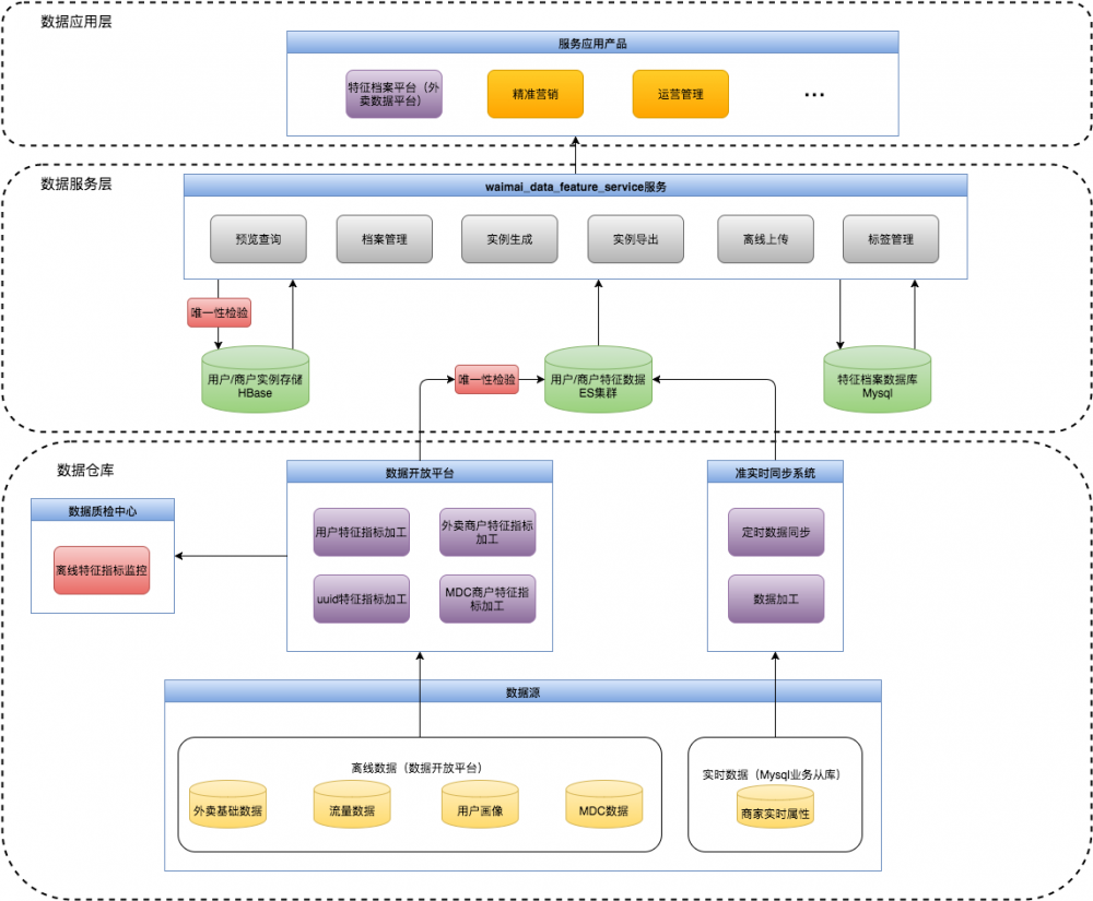 特征档案服务的系统架构如下图所示。主要分为三个部分:数据加工层(数据仓库)、数据服务层(waimai_data_feature_service服务)、数据应用层。