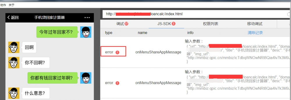 在调试过程中,可以看到js-sdk的初始化过程,如调用 wx.config 是否返回错误信息,wx.ready 是否执行等。
