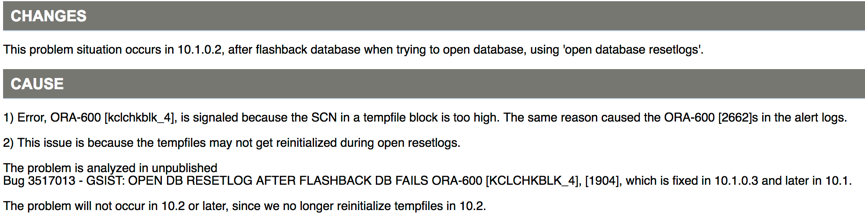 在MOS上其中一篇文档 ID 275902.1,In 10.1.0.2: ORA-600 [kclchkblk_4] and ORA-600 [2662] After Recovery of Database ,这篇文档中讲到在10.1.0.2的版本数据库中做一个不完全恢复并使用resetlogs打开数据库,便会出现ORA-00600 [kclchkblk_4]和ORA-00600 [2662]的错误,该错误是由于临时文件在open resetlogs 时并不会重新初始化,因此使得临时表空间的SCN过高,可以尝试删除所有的临时文件,启动数据库再重建,通常可能正常启动。