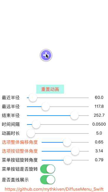 // 动画时长 menu.animationDuration = CFTimeInterval(animationDrationValue.text!) // 最小半径 menu.nearRadius = CGFloat((nearRadiusValue.text! as NSString).floatValue) // 结束半径 menu.endRadius = CGFloat((endRadiusValue.text! as NSString).floatValue) // 最大半径 menu.farRadius = CGFloat((farRadiusValue.text! as NSString).floatValue) // 单个动画间隔时间 menu.timeOffset = CFTimeInterval(timeOffSetValue.text!)! // 整体角度 menu.menuWholeAngle = CGFloat((menuWholeAngleValue.text! as NSString).floatValue) // 整体偏移角度 menu.rotateAngle = CGFloat((rotateAngleValue.text! as NSString).floatValue) // 展开时自旋角度 menu.expandRotation = CGFloat(M_PI) // 结束时自旋角度 menu.closeRotation = CGFloat(M_PI * 2) // 是否旋转菜单按钮 menu.rotateAddButton = rotateAddButton.isOn // 菜单按钮旋转角度 menu.rotateAddButtonAngle = CGFloat((rotateAddButtonAngleValue.text! as NSString).floatValue) // 菜单展示的形状:直线 or 弧形 menu.sDiffuseMenuGrapyType = isLineGrapyType.isOn == true ? .line : .arc // 为方便使用,V1.1.0版本已枚举常见方位,可直接使用,无需再次设置 rotateAngle && menuWholeAngle // 若对于 rotateAngle/menuWholeAngle 不熟悉,建议查看 source 目录下的配置图片 menu.sDiffuseMenuDirection = .above // 上方180° // menu.sDiffuseMenuDirection = .left // 左方180° // menu.sDiffuseMenuDirection = .below // 下方180° // menu.sDiffuseMenuDirection = .right // 右方180° // menu.sDiffuseMenuDirection = .upperRight // 右上方90° // menu.sDiffuseMenuDirection = .lowerRight // 右下方90° // menu.sDiffuseMenuDirection = .upperLeft // 左上方90° // menu.sDiffuseMenuDirection = .lowerLeft // 左下方90°