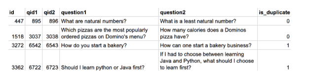 我们数据集所包含的潜在重复问题对(duplicate pairs)超过 40 万行。每一行包含问题对的问题 ID 编号、完整文本以及一个表明这一行是否真正含有重复问题对的二进制值。以下这张图是我们数据集中一些行的示例: