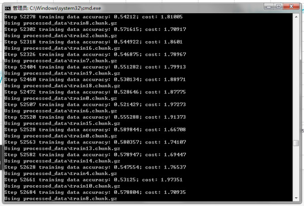 7. 一直训练到准确率增加缓慢为止,应该可以到接近 60%。