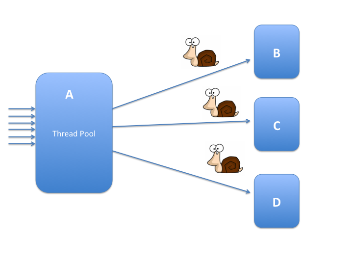 系统A会从Client接收Request, 每个Request的处理都需要多次调用B、C、D的服务,所以完成一个Request可能需要1到2秒的时间。为了让A能更好地支持并发数,系统中使用线程池处理这些Request。当然这是一个非常简化的模型,实际的业务处理比较复杂。
